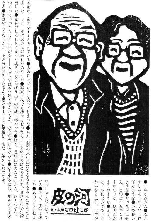 これまでの「皮の河」は、版画家・岩田健三郎さんの版画の魅力はいうまでもありませんが、これまでお読みいただきましたように「岩田さんの文章が面白い!」という声も多く、今回のこのブログの場合には、途中から文章をはじめに掲載して御覧に入れました。